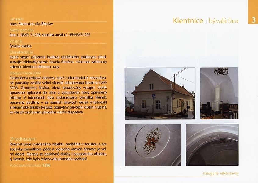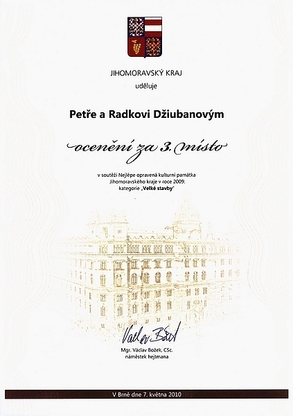 - 3. místo v soutěži „Nejlépe opravená kulturní památka Jihomoravského kraje 2009“